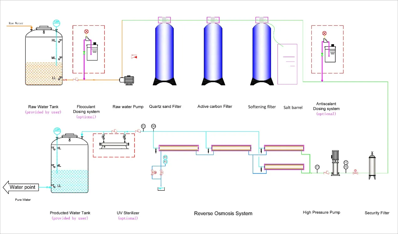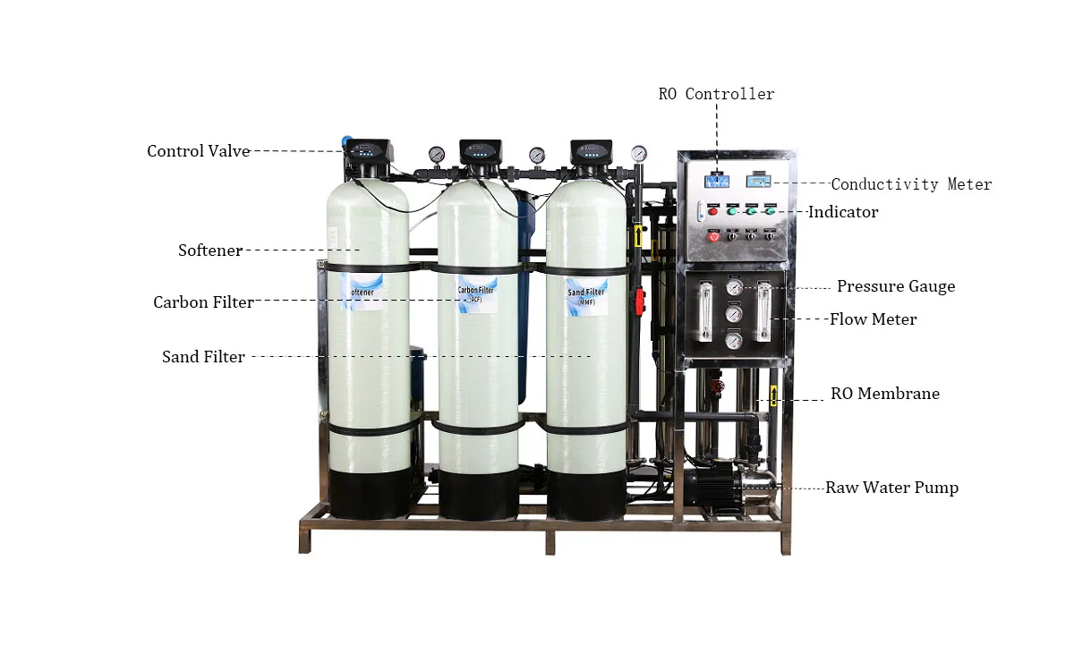 Function: The reverse osmosis equipment that can be used to filter tap water, river water, groundwater, well water which TDS is less than 3000Pppm.The purification of RO machine can reach 96-99%.