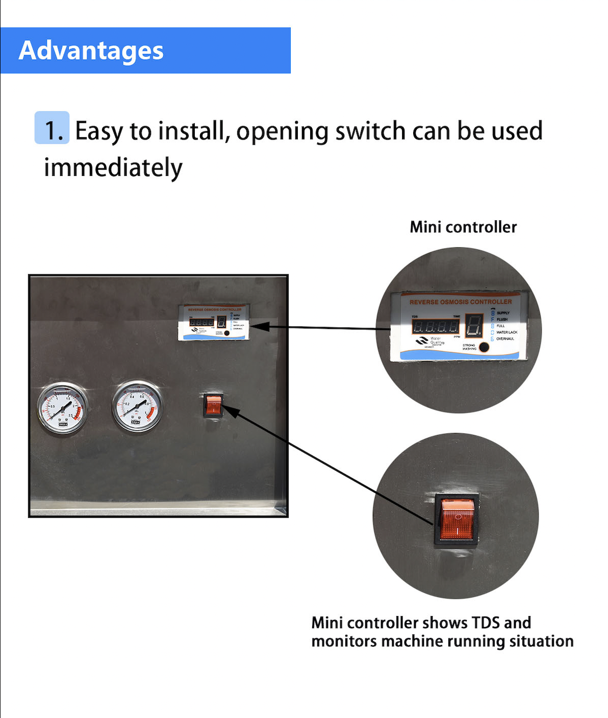 The feature of this product is that it is easy to install, and the start button can be used. In order to achieve the convenient effect, we can install RO membrane and filter elements for customers